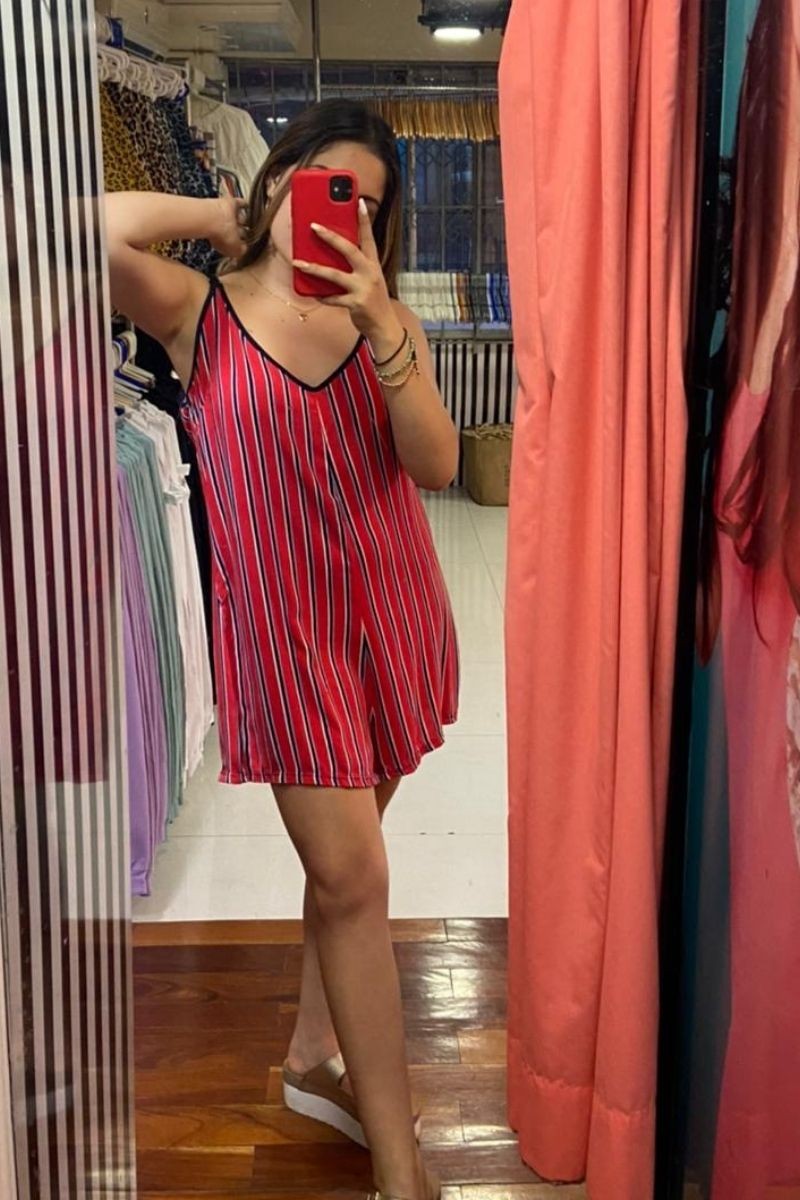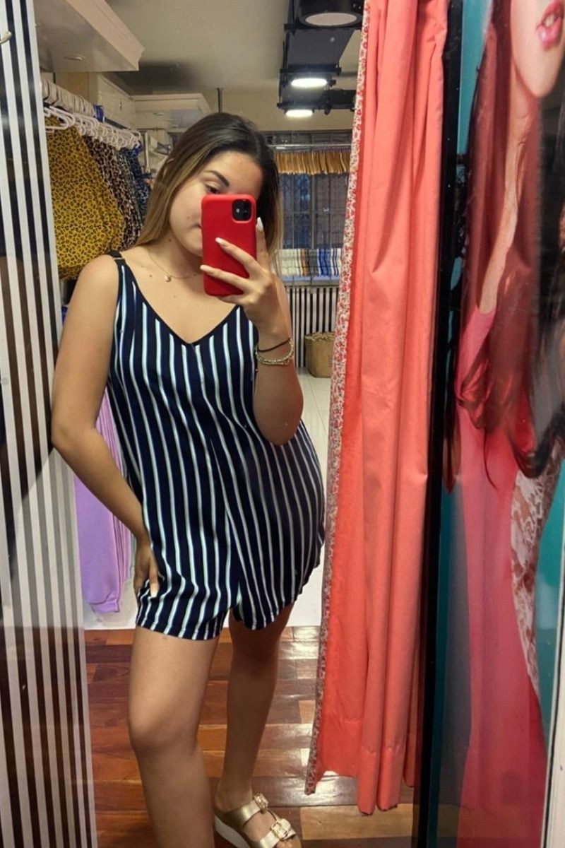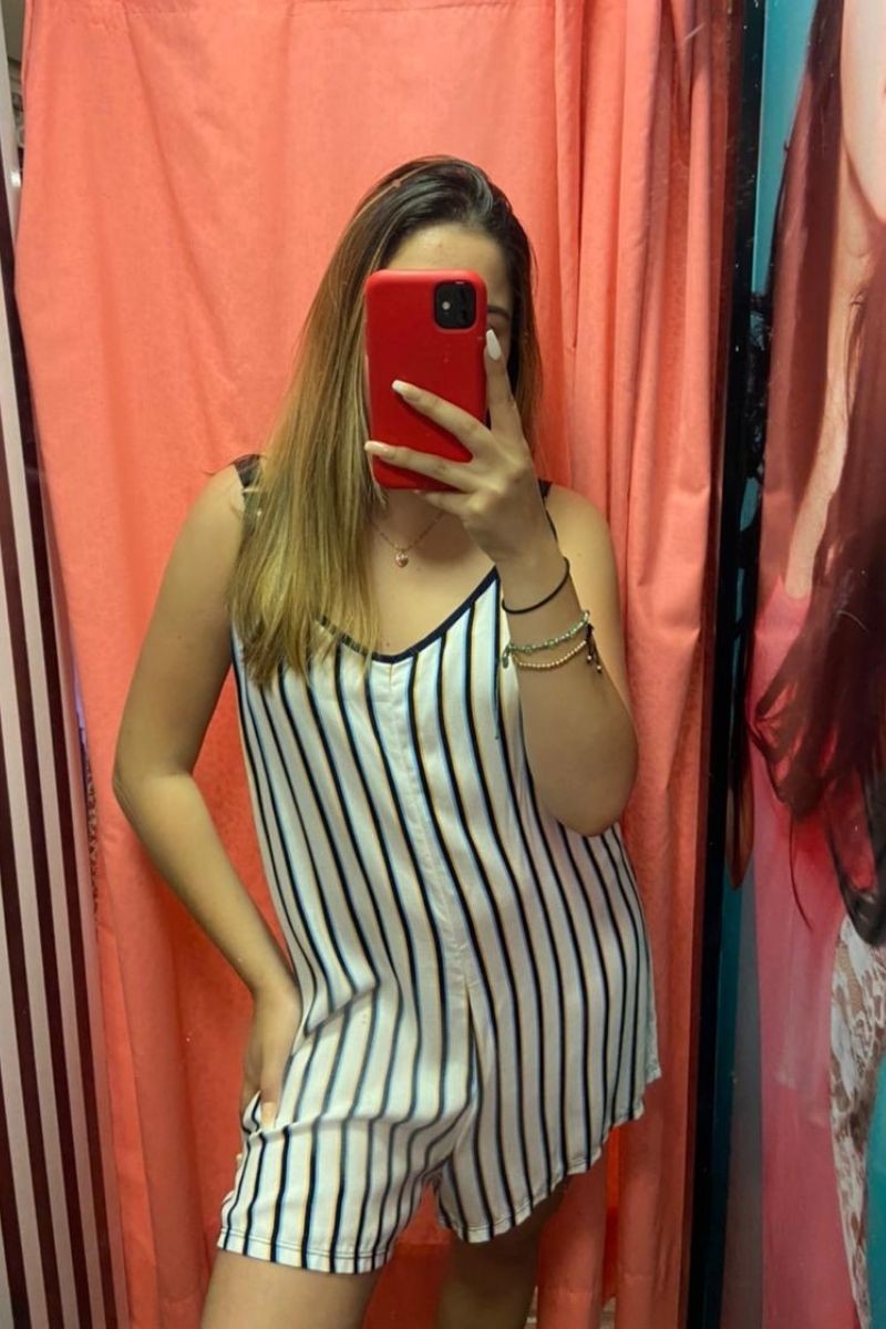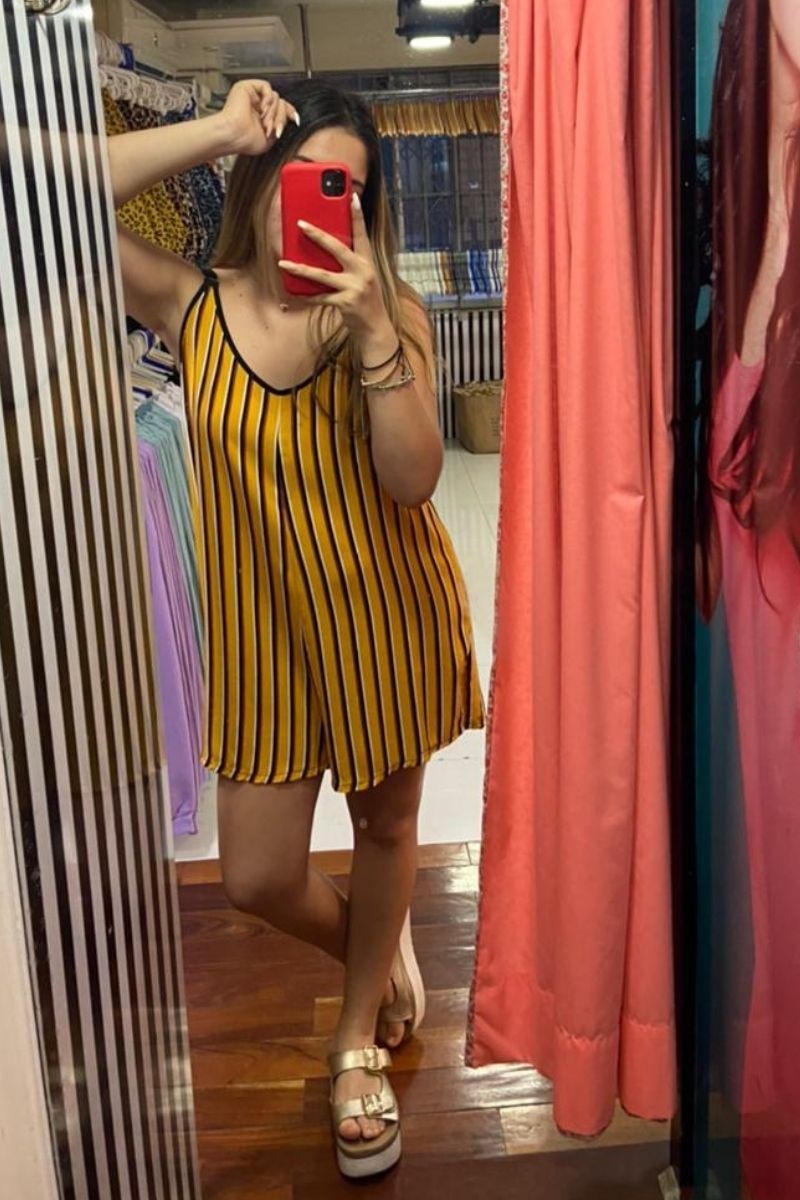 ENTERIZO SHORT DE CHALIS RAYADO, CON TIRAS GRADUABLES DELANTEROS Y LAZO. COMPOSICIÓN: CHALIS